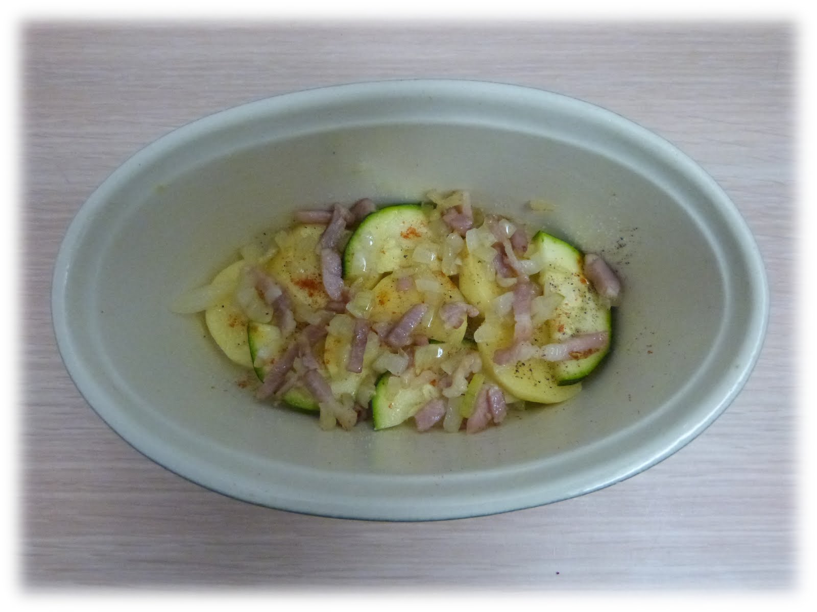 - Beurrer un plat allant au four et y mettre une couche de pommes de terre et courgette, des lardons et assaisonner. Répéter l'opération. Quand on arrive à la dernière couche, mettre un peu d'huile d'olive et finir par une couche de fromage râpé.